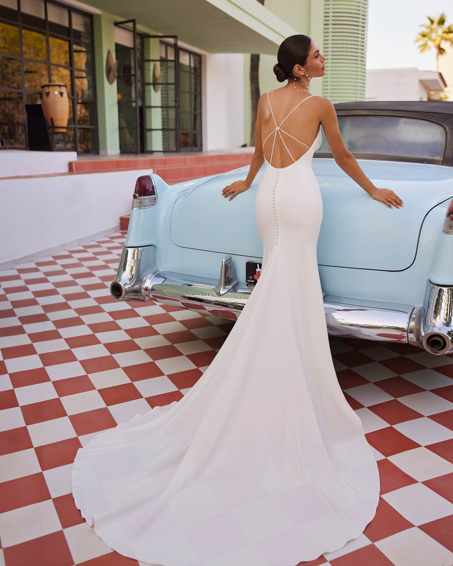 1S201 JACE Vestido de novia largo de dos piezas con corte sirena. Crepé bielástico Vera, escote pico, espalda con tirantes cruzados y capa. Solicita tu cita Encuentra tu tienda