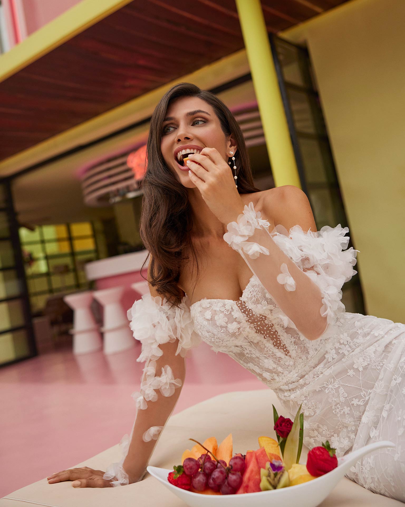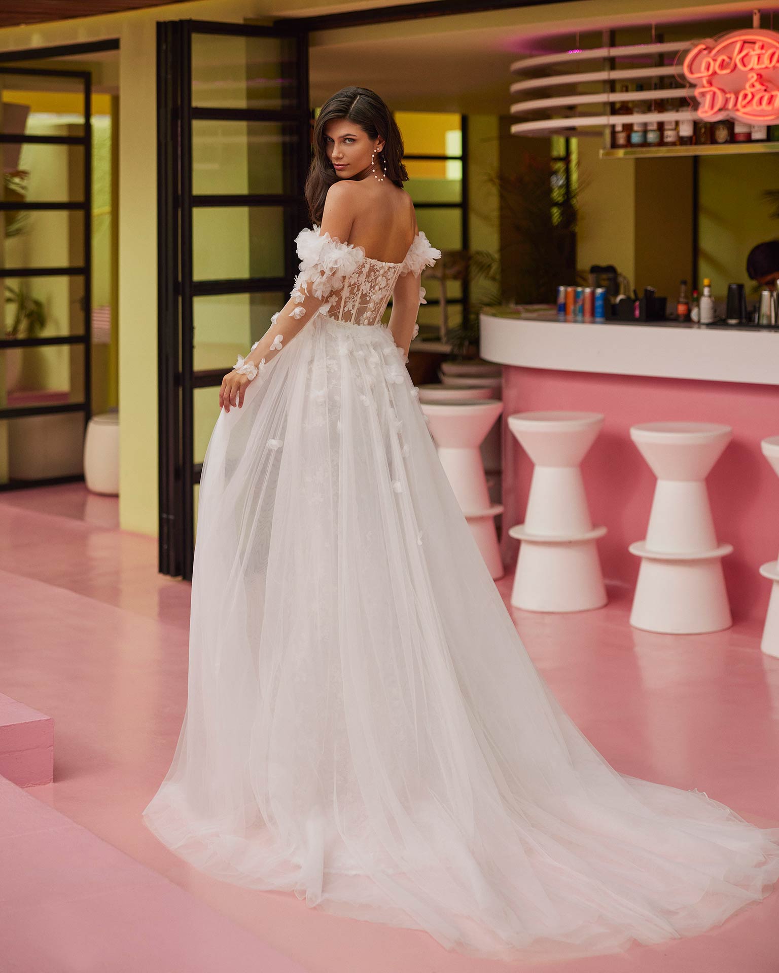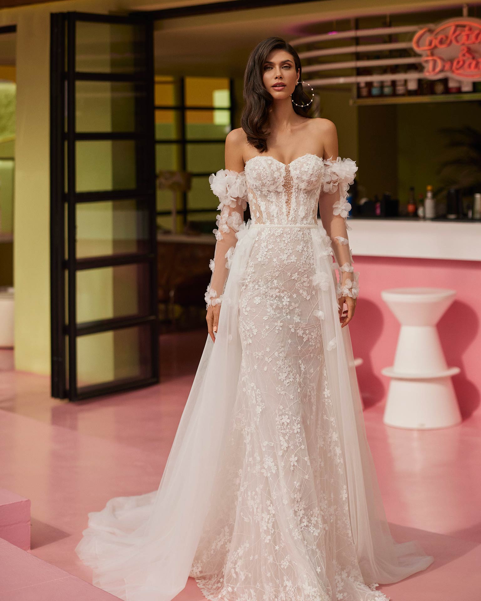 1S221 JASMYN Vestido de novia largo de dos piezas con corte recto. Encaje y pedrería, escote corazón, mangas extraíbles y espalda abierta con sobrefalda. Solicita tu cita Encuentra tu tienda
