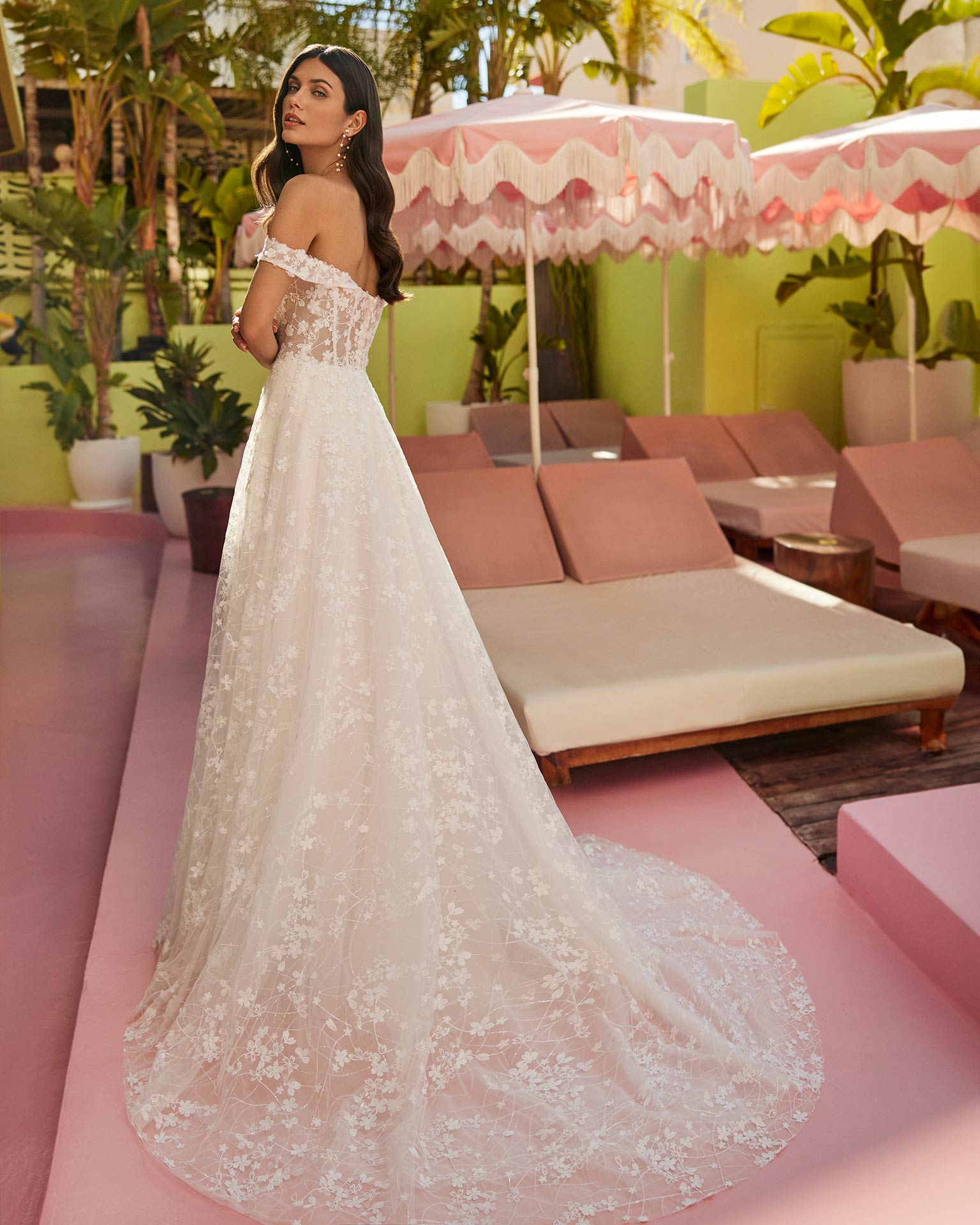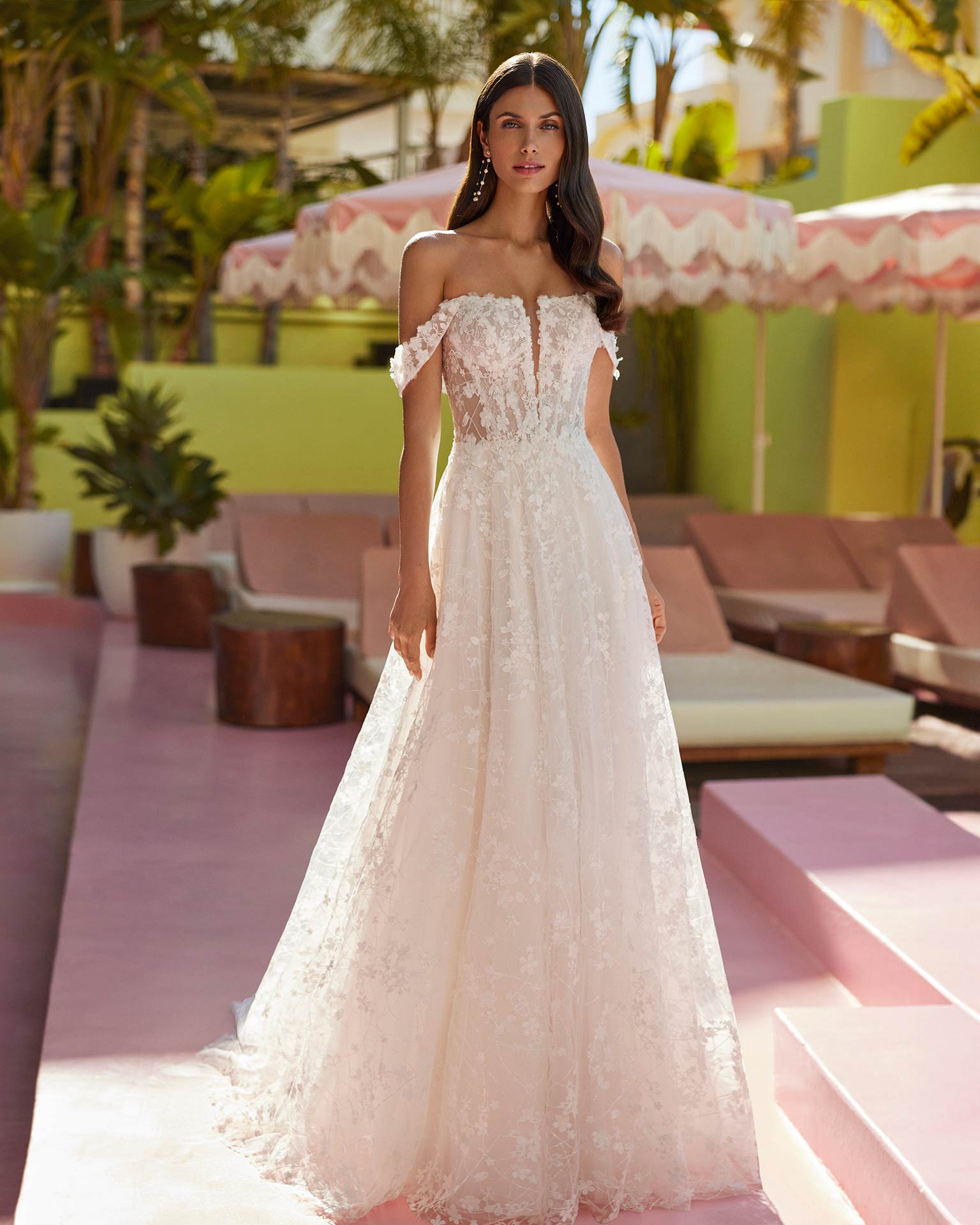 Vestido de novia largo de corte princesa. Encaje y pedrería, escote palabra de honor, tirantes caídos y espalda escotada. LUNA_NOVIAS.