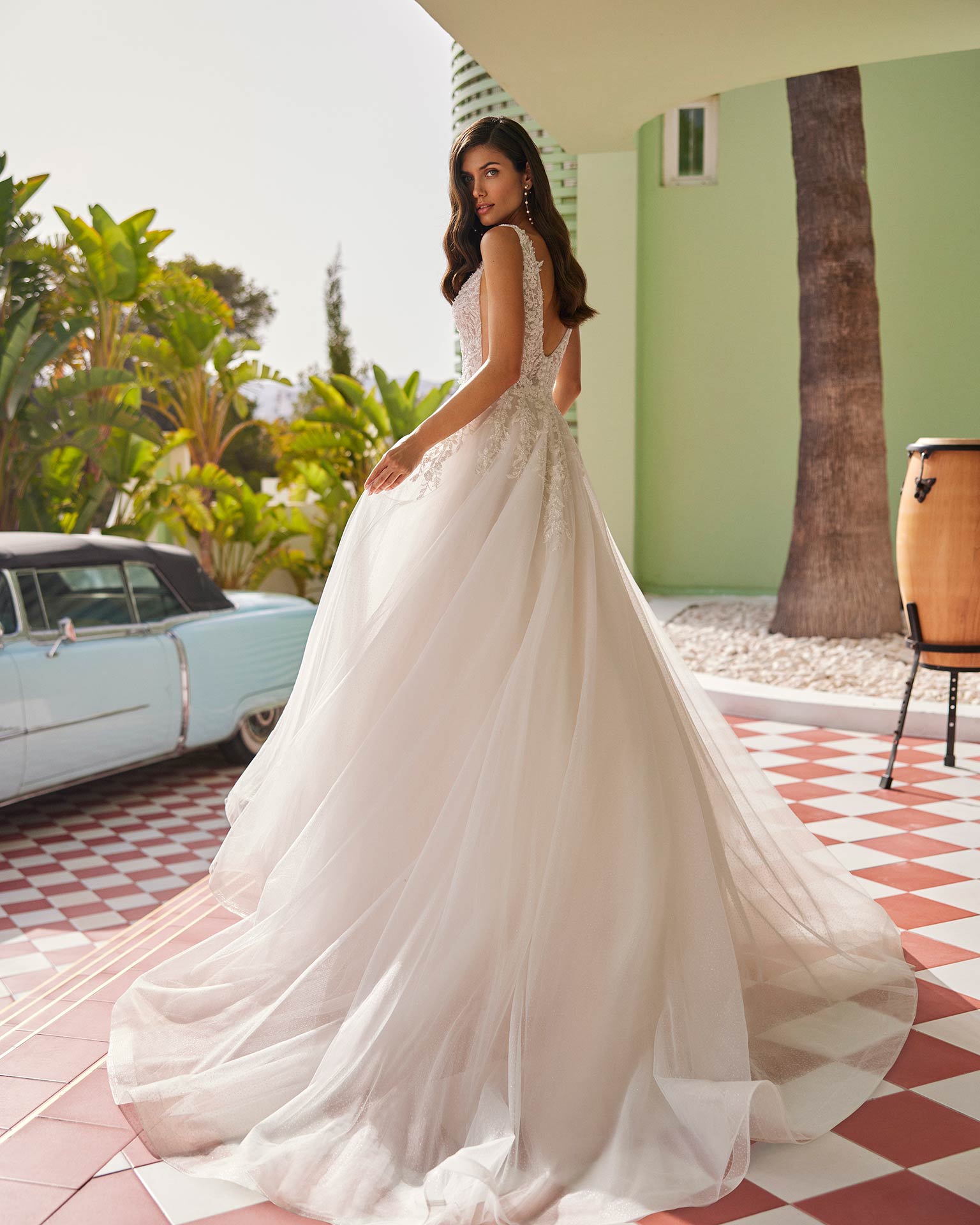 1S132 JERMA Vestido de novia largo de corte volumen. Tul Glitter, escote profundo, tirantes y espalda escotada. Solicita tu cita Encuentra tu tienda