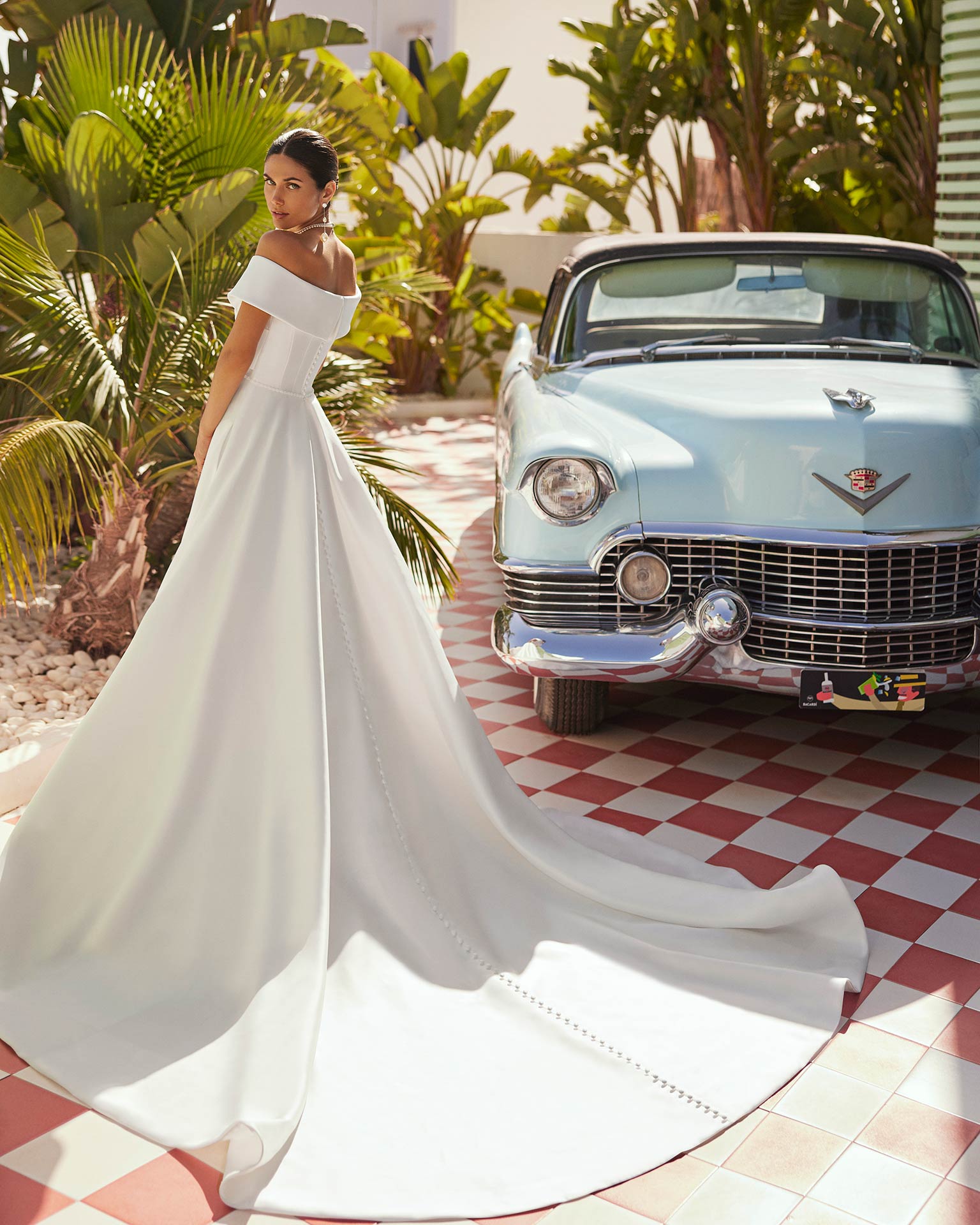 Vestido de novia largo de corte volumen. Mikado Verona, escote bajo hombros, espalda escotada y falda con abertura lateral. LUNA_NOVIAS.